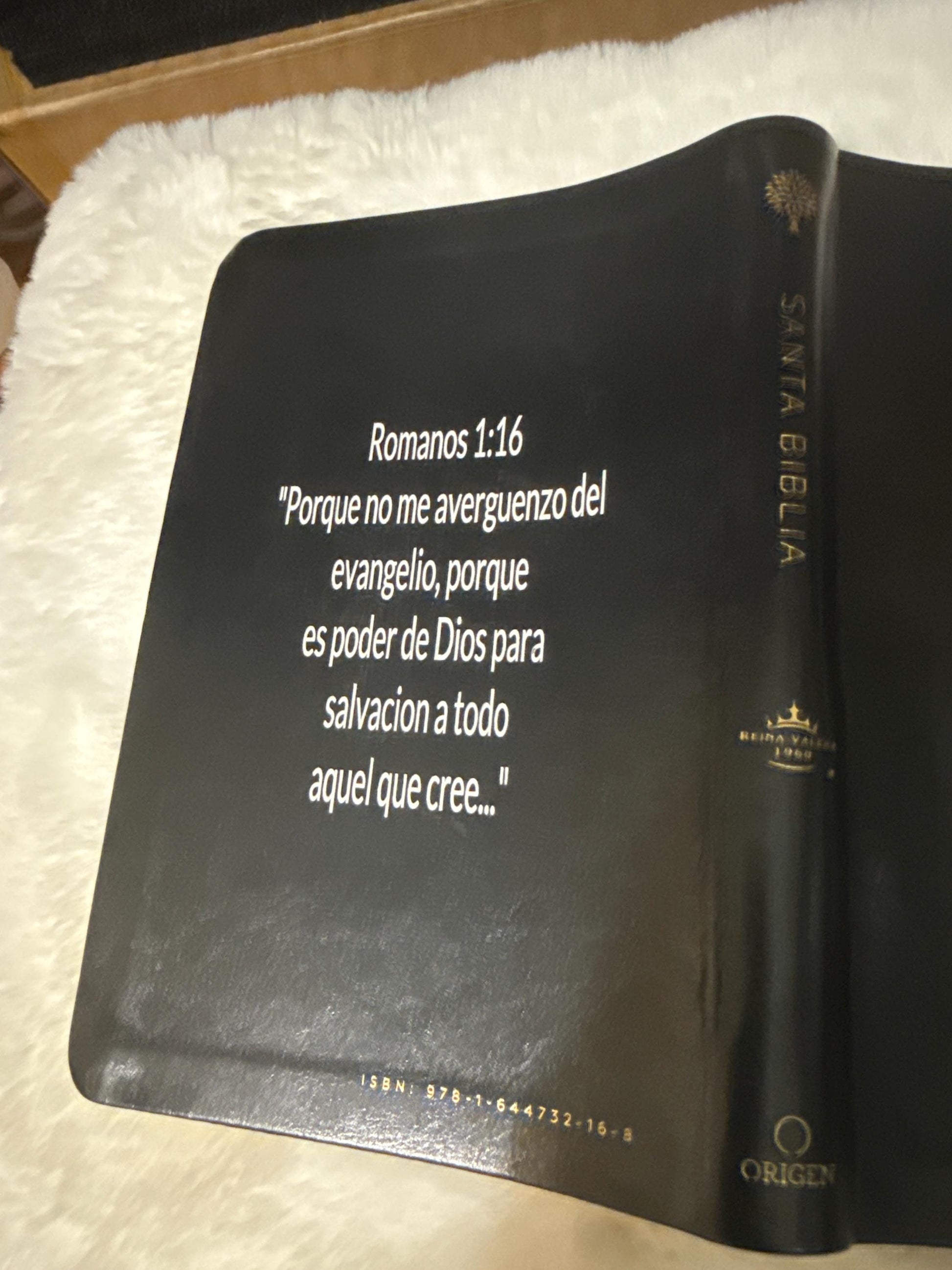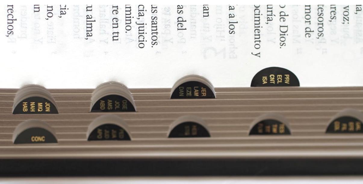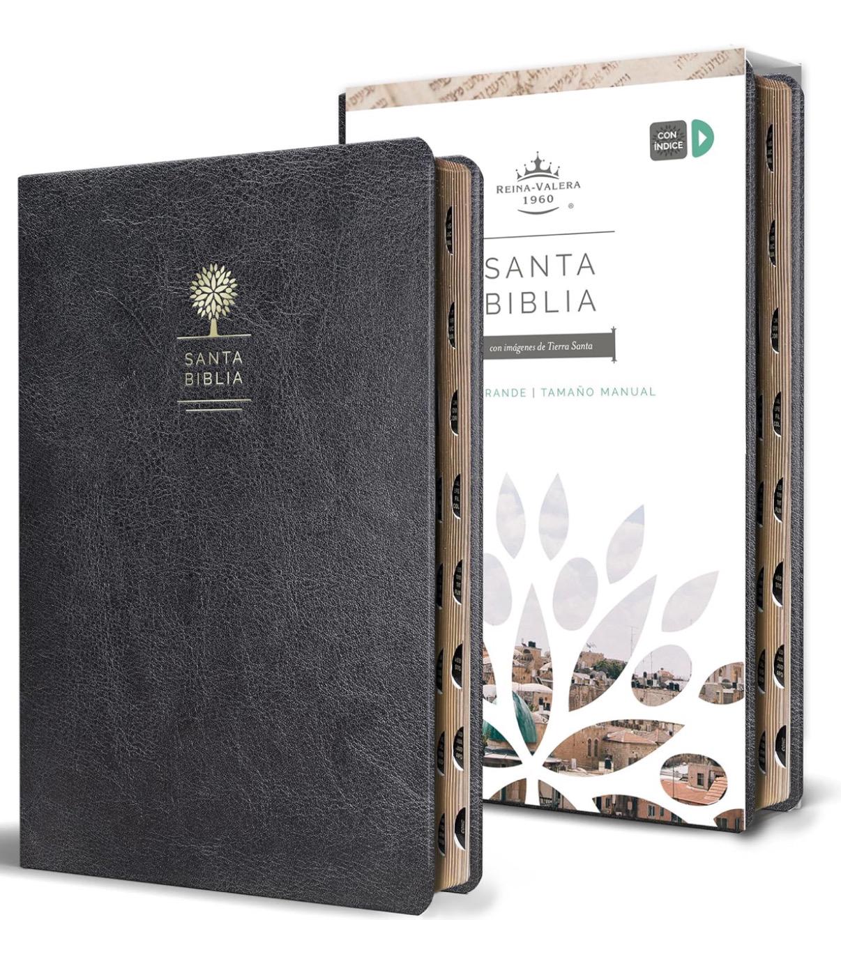 Biblia tamaño manual, ultrafina, con letra grande. Símil piel negro, con índice en el canto, cinta marcadora y fotos a color de Tierra Santa.