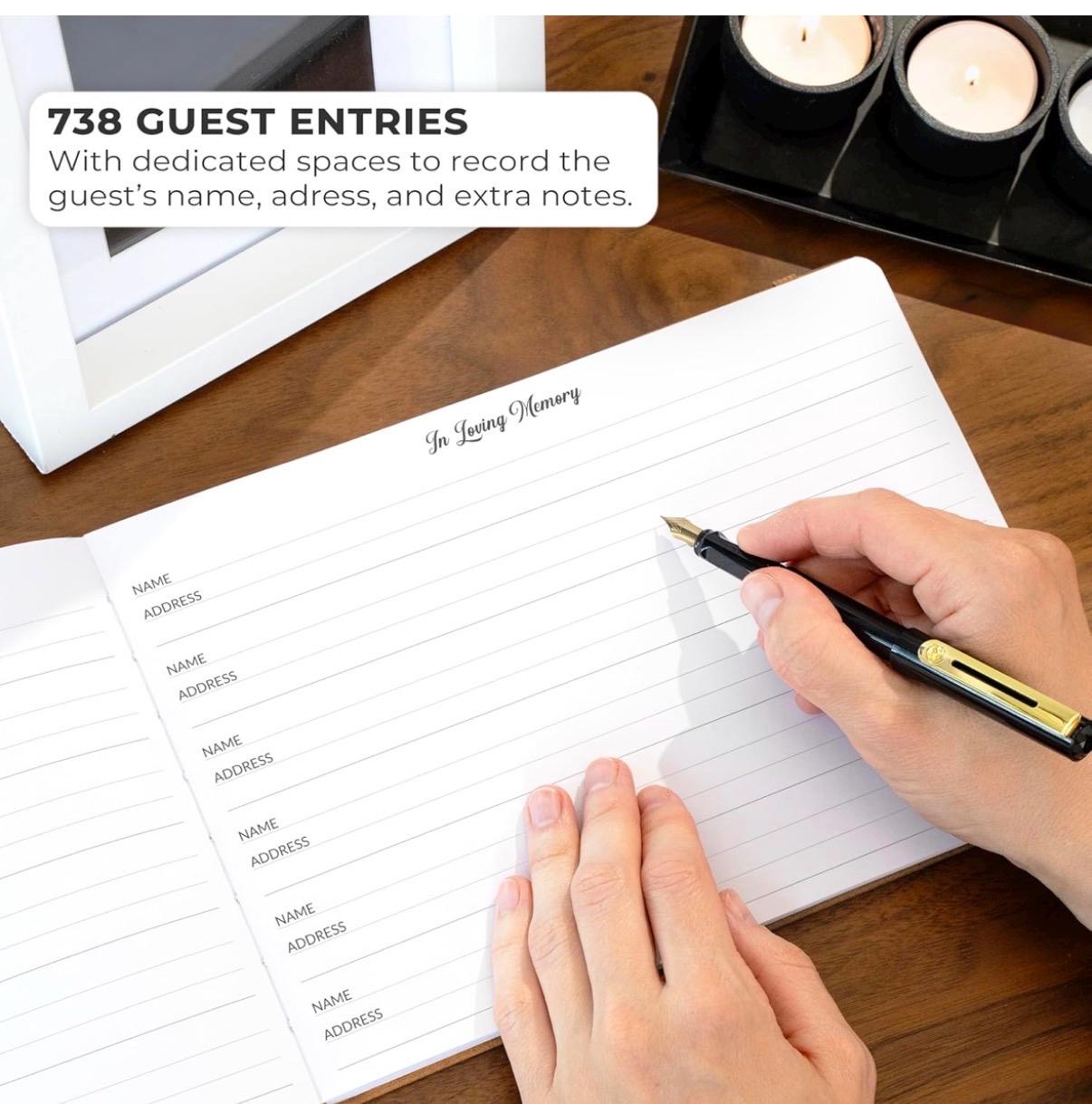 This funeral sign-in book has space for up to 738 guests to add their details and condolences.