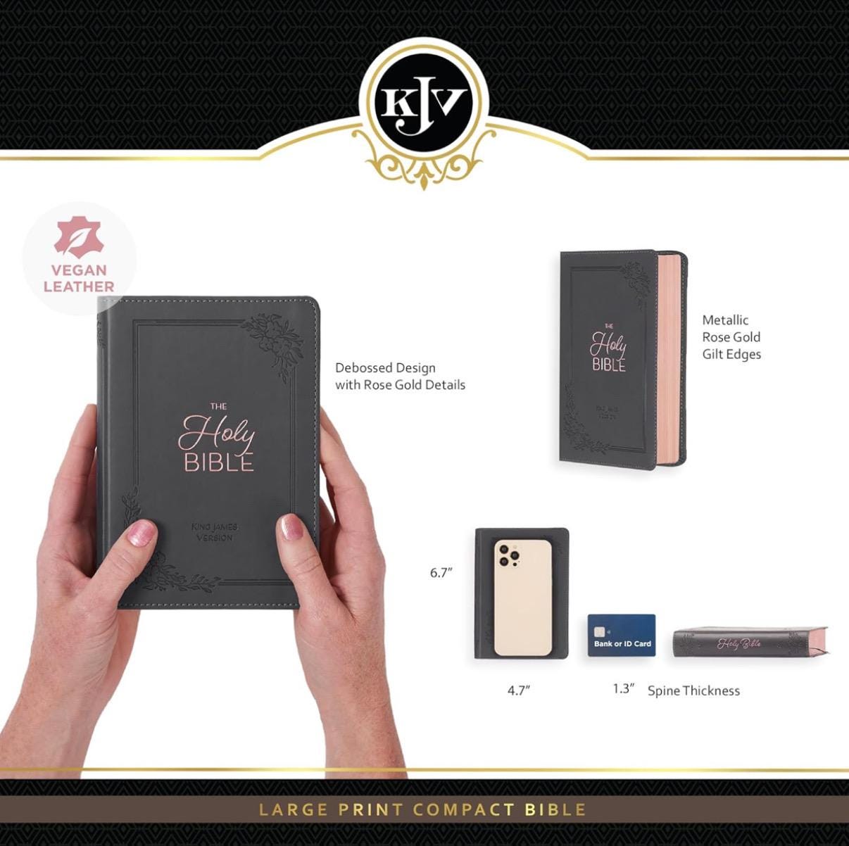 The Cobalt Gray Large Print Compact King James Version Bible is the perfect gift for commemorating significant milestones such as birthdays or graduations. Its stunning gray faux leather cover, compact size, and outstanding features make it a highly treasured book. Whether it's for a friend, daughter, or mother, this Bible's elegant and feminine design ensures that it becomes her trusted travel companion. With its exceptional attributes and stylish appearance, the Cobalt Gray Large Print Compact King James Version Bible is bound to leave a lasting impression on its recipient.
