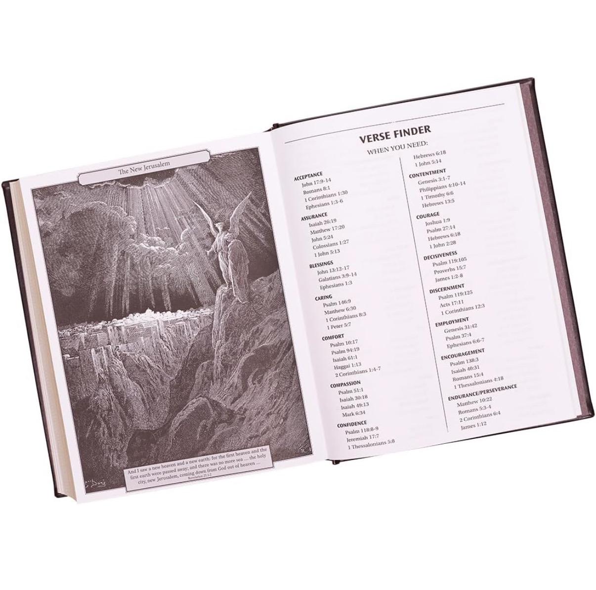 This magnificent, heirloom-quality King James Version Family Bible will become a beloved keepsake to be passed down from generation to generation. The beloved 1769 Classic King James text is printed in deep black on heavyweight paper in a large font.