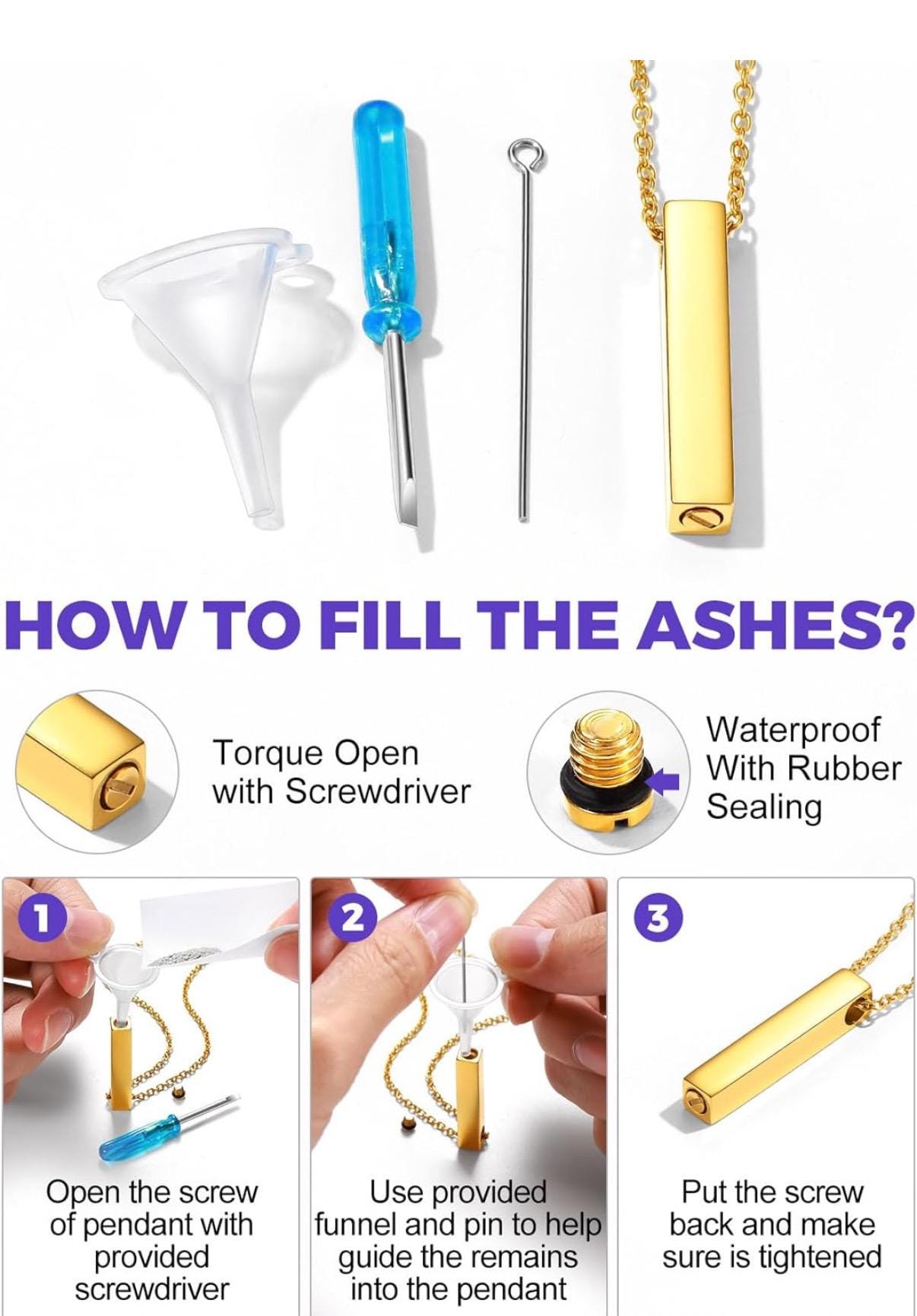 Urn Necklace For Ashes: Classic bar pendant urn cremation necklace for men women with adjustable chain, memorial keepsake for beloved's ashes Our secure threaded screw of the solid container inside the locket keeps contents safe even with daily wear It could holds for ashes, hair, small amount of dried flowers, perfume, cremains Waterproof, allows you to cherish the memories of your loved one forever!